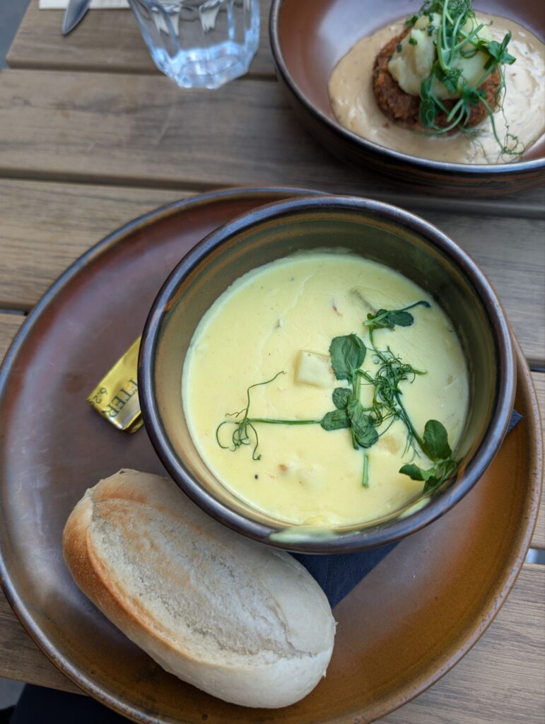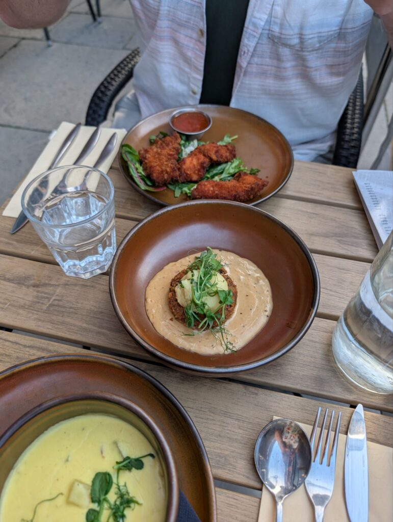 By the time I woke back up and de-groggified myself, we decided to have dinner at a nearby restaurant, and stuck to appetizers, because we had already eaten. It turned out to be a very wise call; the food was excellent, and the portion sizes were just right. I ordered a bowl of cullen skink, he ordered some chicken strips, and we shared a haggis fritter.
