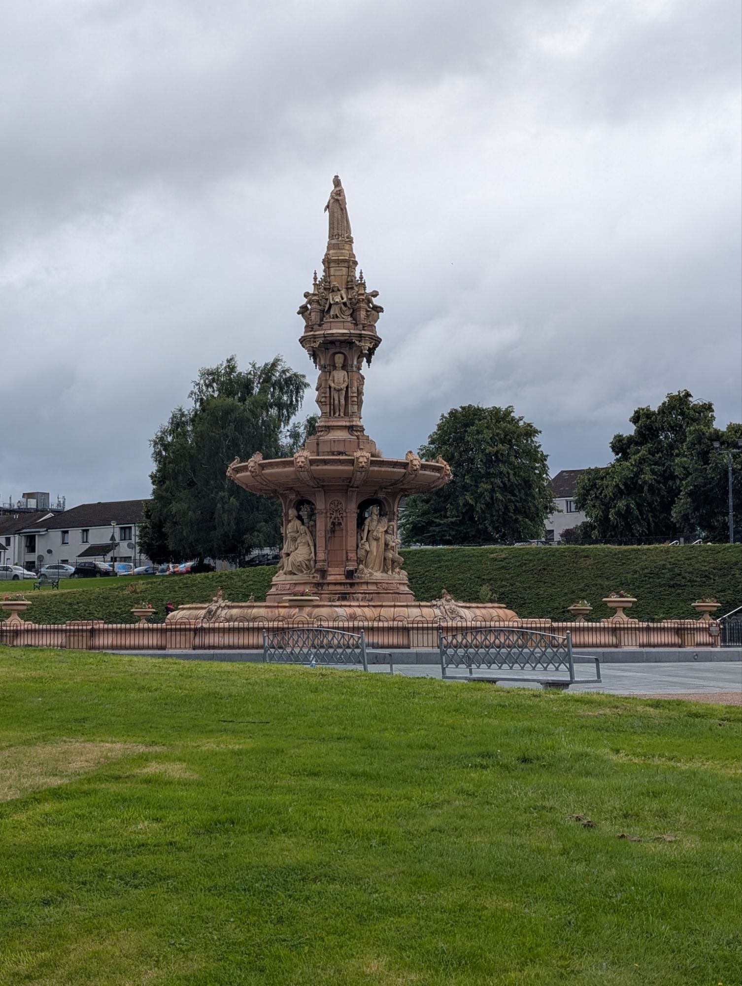 Like the Necropolis a few days ago, Glasgow Green had surprisingly few people in it. Maybe it was the grey, rainy weather. But the brightness and softness of the grass, the swans on the nearby river, and the clarity of the air made me feel that they’re missing out on something special. The Green was quiet and soothing. In places like the People’s Palace and the Doulton Fountain, the overall aspect of disrepair and paused renovations reinforced that feeling of sombreness.